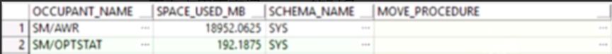 结果显示,AWR快照和OPTSTAT统计信息是主要占用对象。