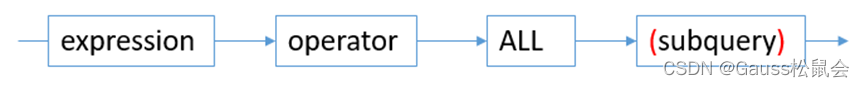 右边的子查询,它必须只返回一个字段。左边表达式使用operator对子查询结果的每一行进行一次计算和比较(=、<>、<、<=、>、>=),其结果必须是布尔值。如果全部获得真值,ALL结果为"真"(包括子查询没有返回任何行的情况)。如果至少获得一个假值,则结果是"假"。