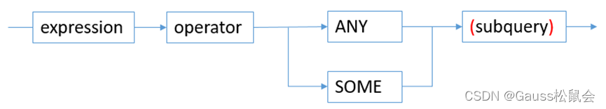 右边的子查询,它必须只返回一个字段。左边表达式使用operator对子查询结果的每一行进行一次计算和比较(=、<>、<、<=、>、>=),其结果必须是布尔值。如果至少获得一个真值,则ANY结果为“真”。如果全部获得假值,则结果是“假”(包括子查询没有返回任何行的情况)。