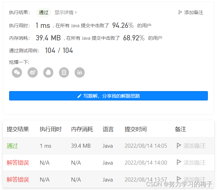 输入:s = "011101" 输出:5 解释: 将字符串 s 划分为两个非空子字符串的可行方案有: 左子字符串 = "0" 且 右子字符串 = "11101",得分 = 1 + 4 = 5 左子字符串 = "01" 且 右子字符串 = "1101",得分 = 1 + 3 = 4 左子字符串 = "011" 且 右子字符串 = "101",得分 = 1 + 2 = 3 左子字符串 = "0111" 且 右子字符串 = "01",得分 = 1 + 1 = 2 左子字符串 = "01110" 且 右子字符串 = "1",得分 = 2 + 1 = 3