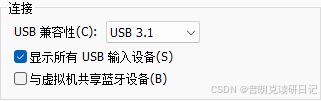 3.点击VMware Workstation菜单里的“虚拟机”->"设置",进入“虚拟机设置”界面,选择“硬件”标签页的“USB控制器”,在左侧的界面里勾选“显示所有USB输入设备(S)”,并把顶部的“USB兼容性(C)”改为USB2.0。