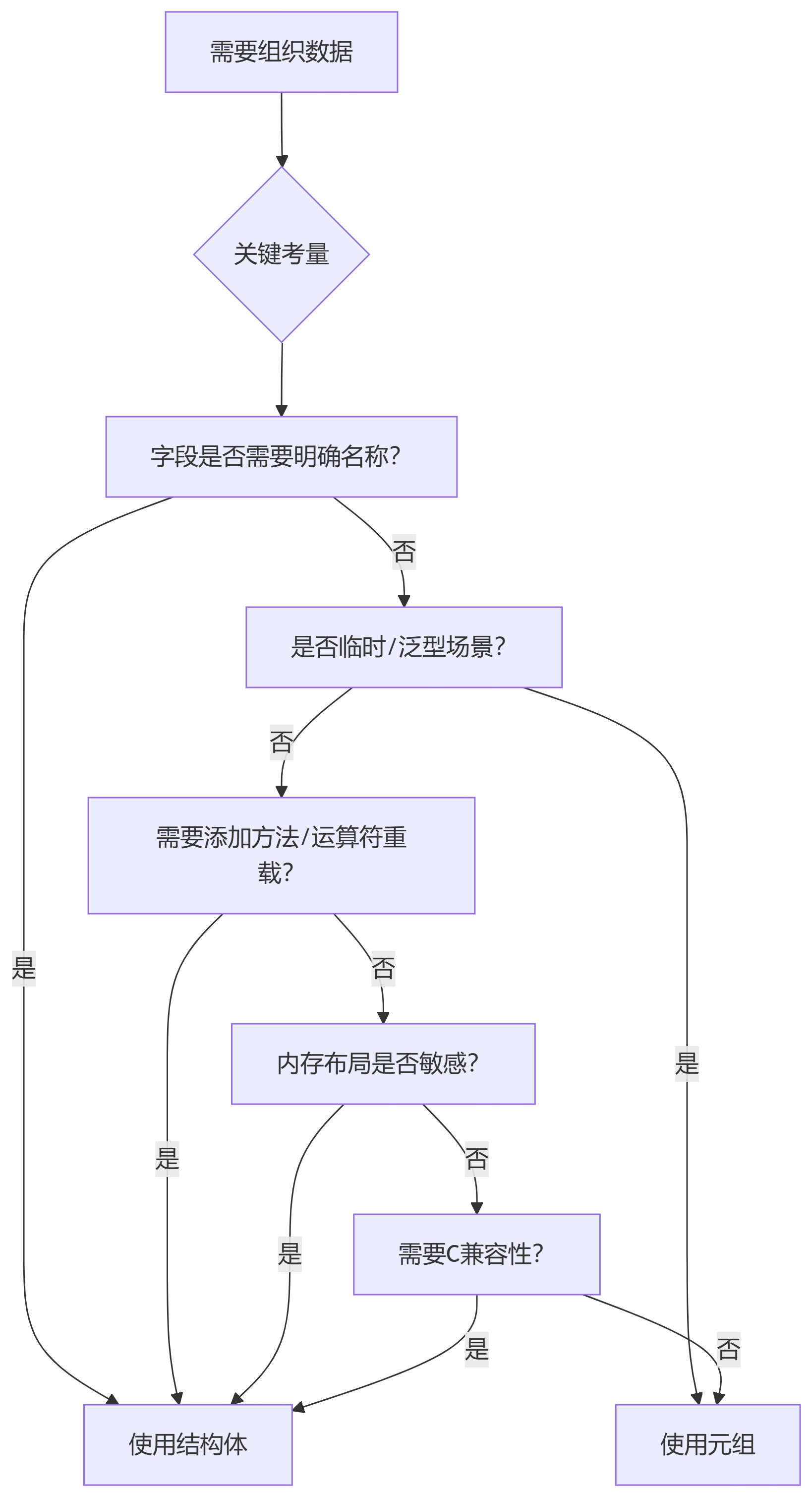 - 可维护性优先:当字段超过三个或需长期维护时,总是选择结构体