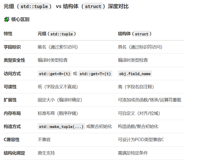 C++ tuple 是一个功能强大的工具,它提供了灵活的方式来组合不同类型的数据。随着 C++17 的结构化绑定,tuple 的使用变得更加简洁。在需要返回多个值或者临时组合数据时,tuple 是一个很好的选择。但在性能敏感的场景中,要注意 tuple 可能带来的拷贝开销(可以通过引用或移动语义优化)。