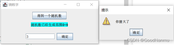 JOptionPane.showMessageDialog(null, "你猜小了", "提示", JOptionPane.WARNING_MESSAGE);