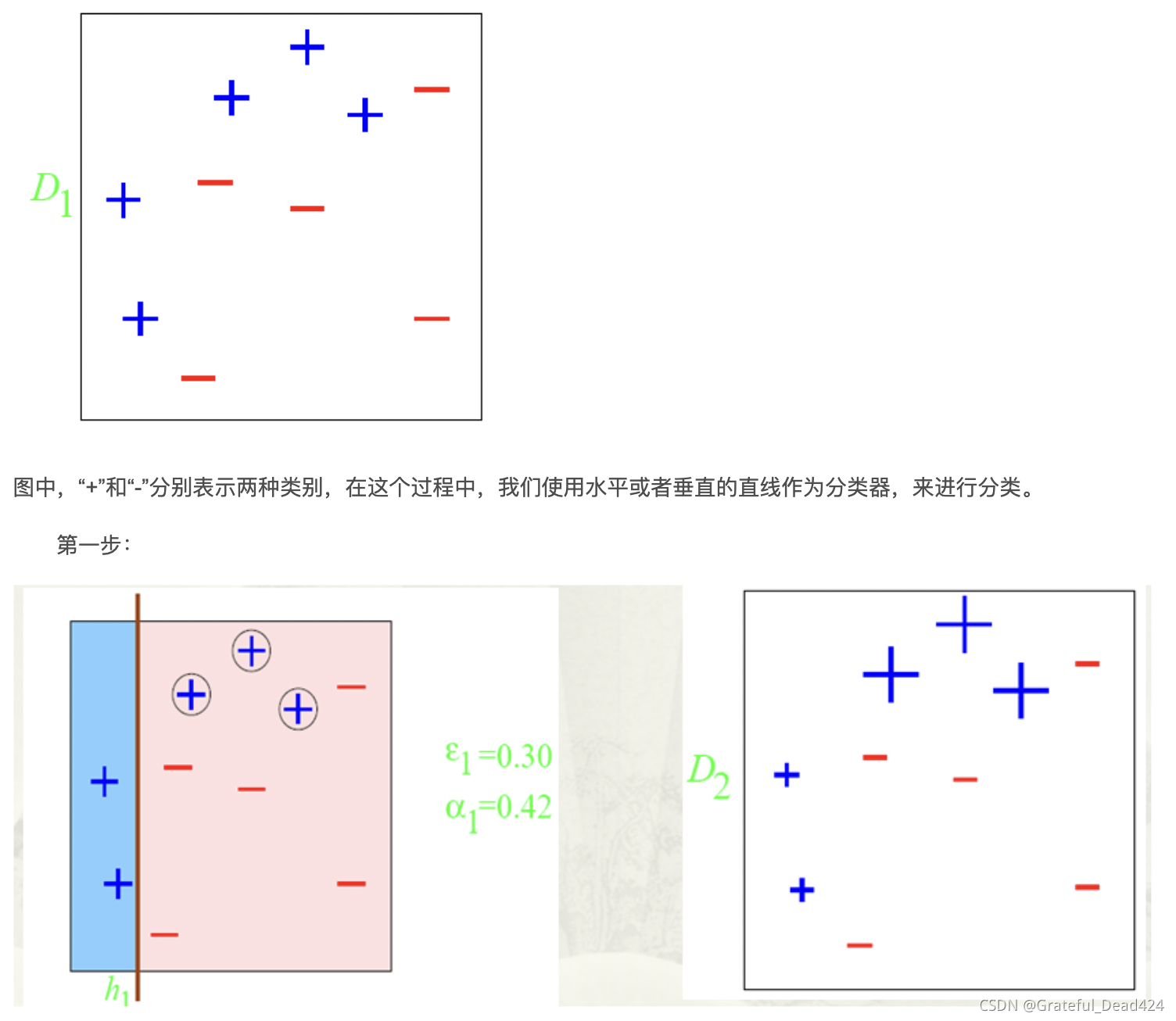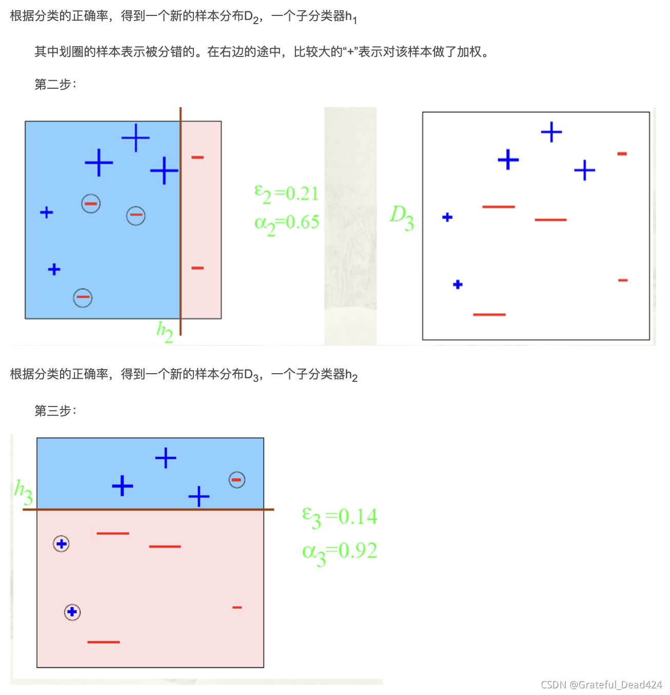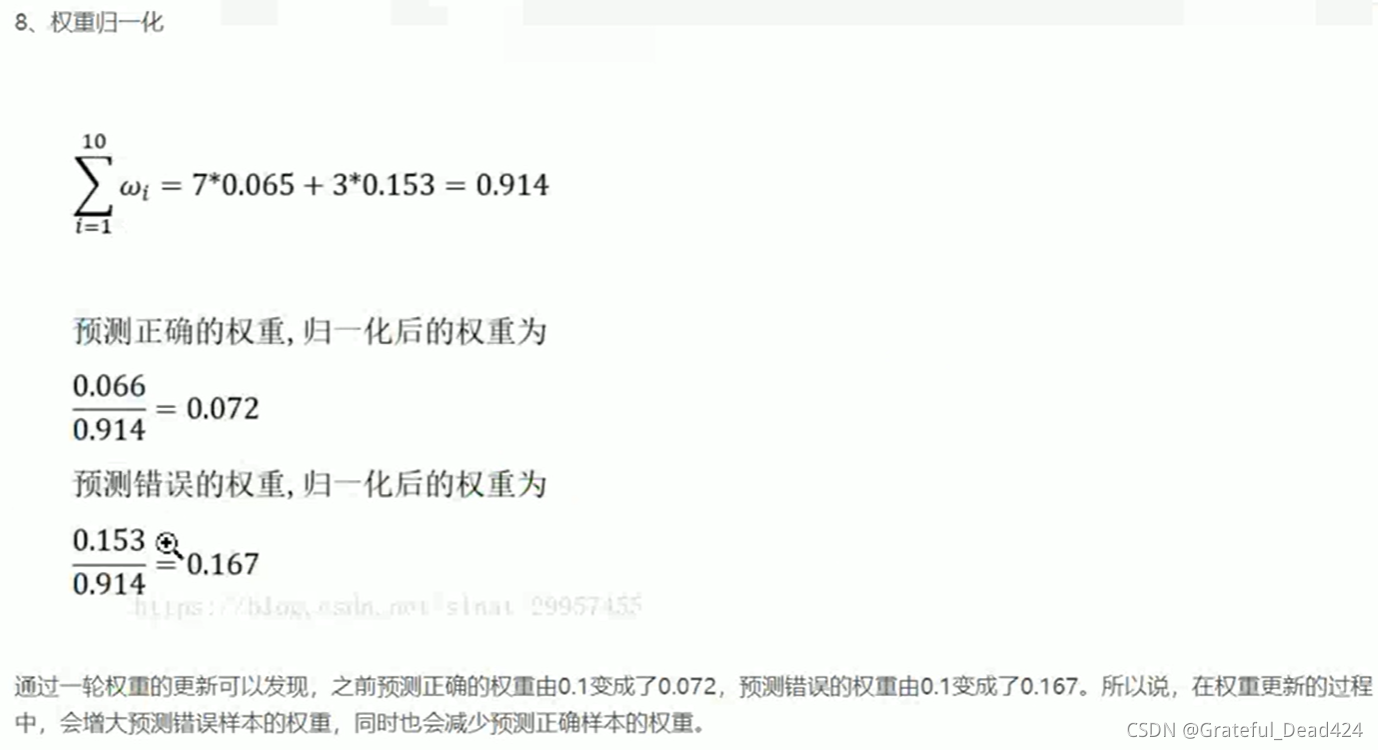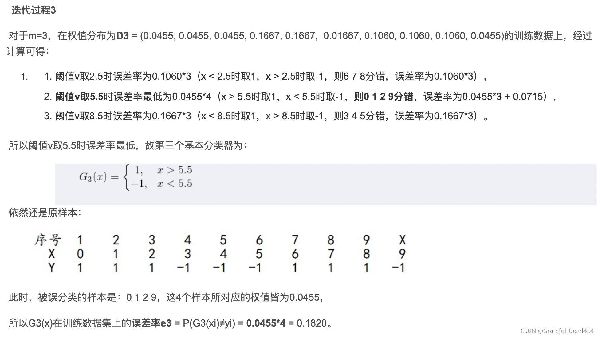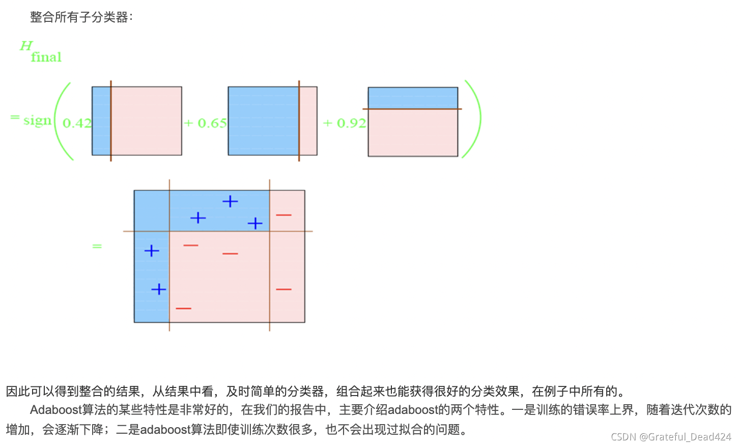 从上述第一轮的整个迭代过程可以看出:被误分类样本的权值之和影响误差率,误差率影响基本分类器在最终分类器中所占的权重