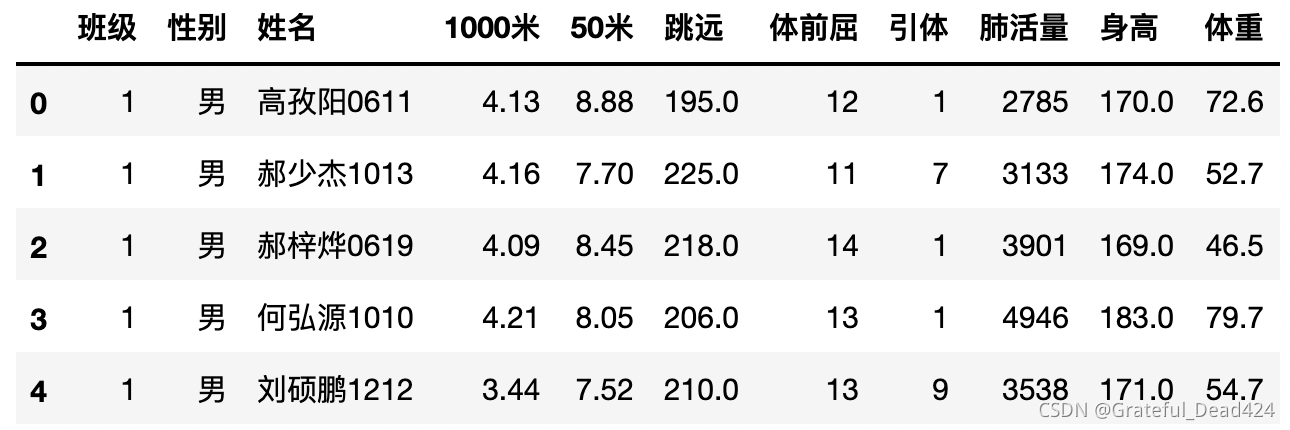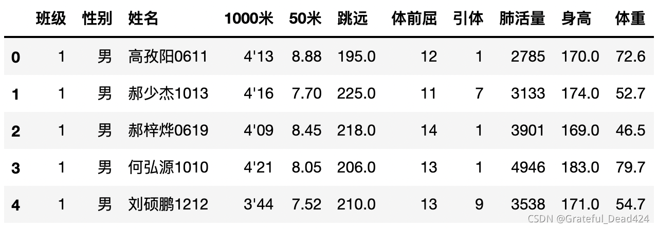 data.columns = ['班级', '性别', '姓名', '男1000', '男50米跑', '跳远', '体前屈', '引体', '肺活量', '身高', '体重']