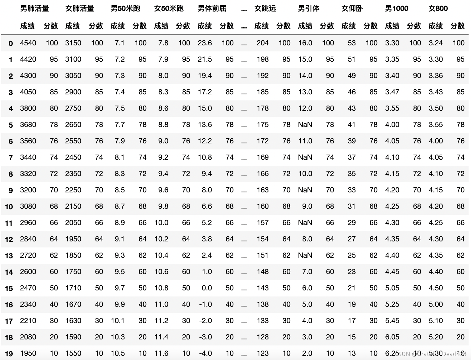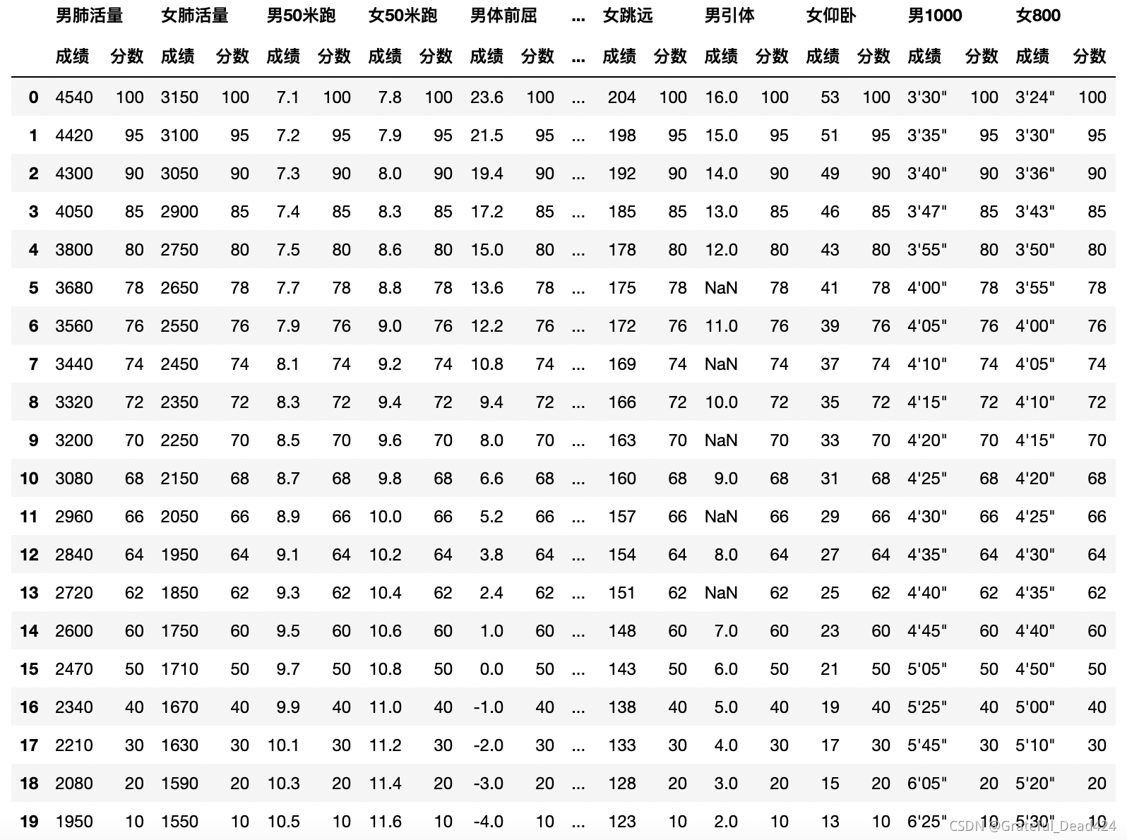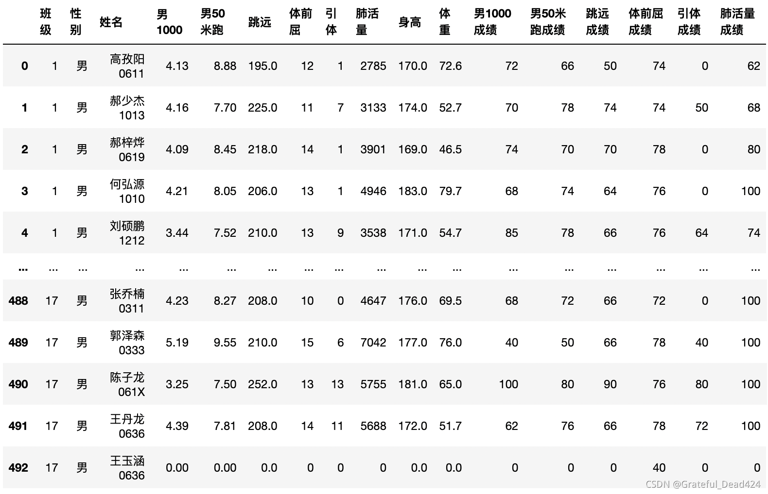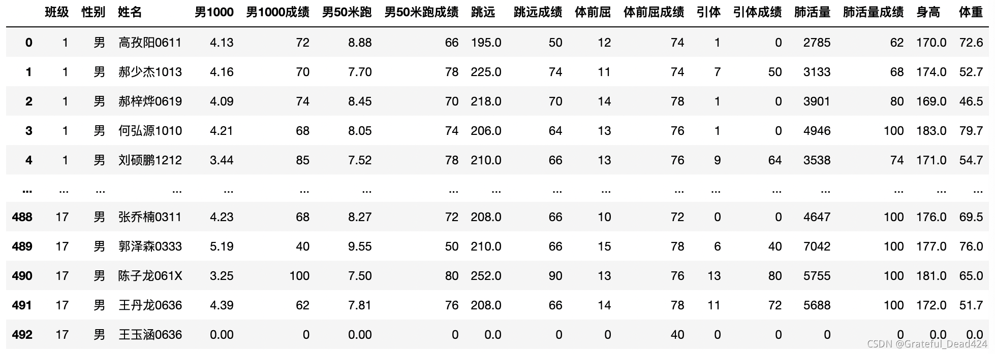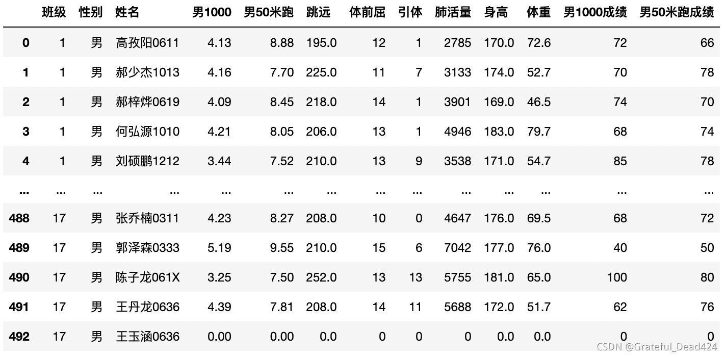 cols = ['班级', '性别', '姓名', '男1000','男1000成绩','男50米跑','男50米跑成绩','跳远','跳远成绩','体前屈','体前屈成绩','引体','引体成绩', '肺活量','肺活量成绩','身高','体重']