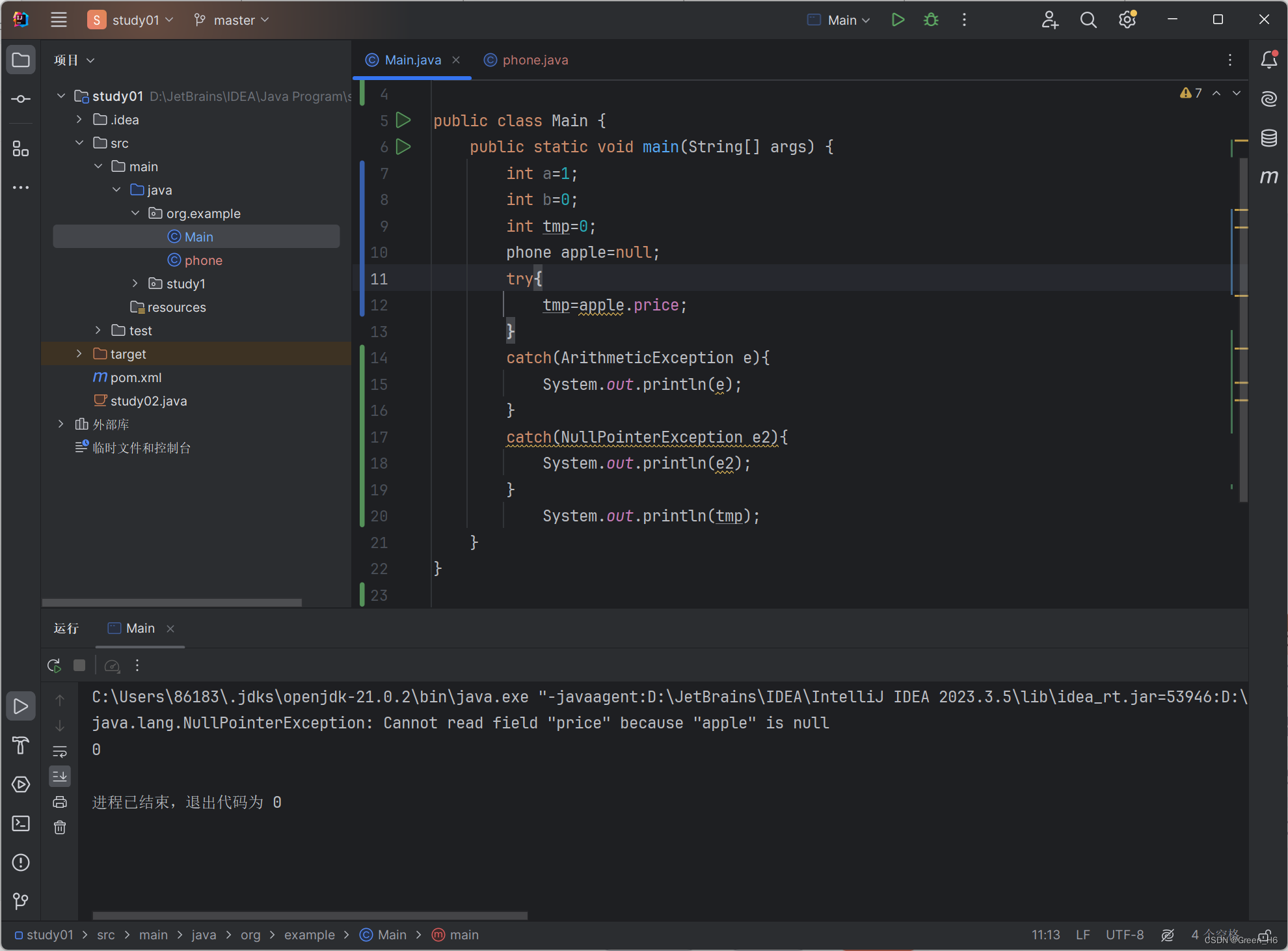 同时一个try语句可以与多个catch语句进行搭配,换一种空指针赋值会得到另一种报错