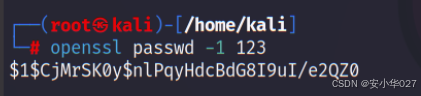 - openssl passwd -1 123:使用 openssl 这个开源加密工具包,通过 - 1 参数指定 MD5 加密算法对密码 “123” 进行加密,MD5 会将输入转为 128 位哈希值。