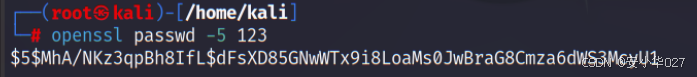 - openssl passwd -5 123:同样利用 openssl 进行密码处理,-5 参数表示采用更安全的 SHA-256 哈希算法对 “123” 加密,其生成 256 位哈希值,且因加密含随机因素(如盐值),每次结果不同,增加密码安全性。