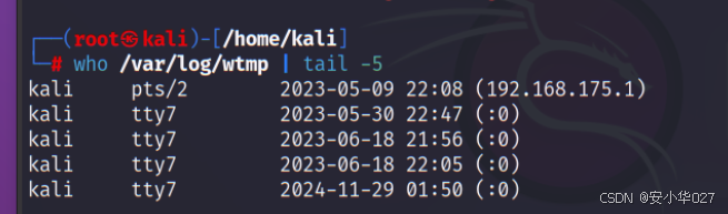 - 二进制日志查看:who /var/log/wtmp | tail -5,先通过who命令显示当前登录用户信息,结合管道符将输出作为tail -5的输入,查看二进制登录注销日志文件的最后 5 行记录。