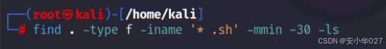 - find. -type f -iname '*.sh' -mmin -30 -ls:在当前目录查找 30 分钟内修改过、文件名以.sh结尾的普通文件并长列表显示。