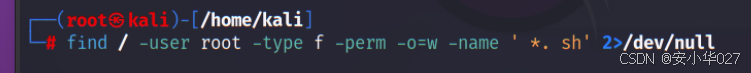 - find / -user root -type f -perm -o=w -name ' *.sh' 2>/dev/null:在整个文件系统下查找所有者为 root、其他用户有写权限且文件名以.sh结尾的普通文件,将错误输出重定向不显示。