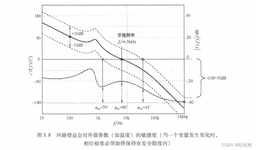 由于产品离散型以及温度等原因,环路增益可能会被外部参数影响而改变, 而环路增益将改变 0dB 点的位置,从而改变其对应的相位裕度。增益裕度可被理解为 0dB 点移动到 -180° 时的环路增益改变量