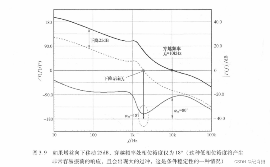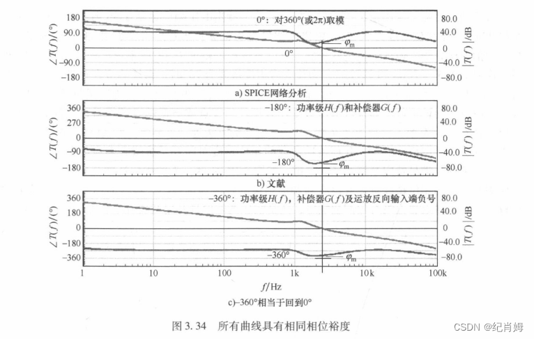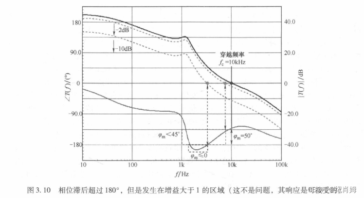 此时依旧需要重提一个重要的概念,即相位裕度是指 fc 处相位距离振荡点处相位的距离,而不是距 0° 或者 180° 间距离,只有考虑到奇数个反向输入且系统的所有原点零极点都被写入传函的时候才设定 180° 为振荡点