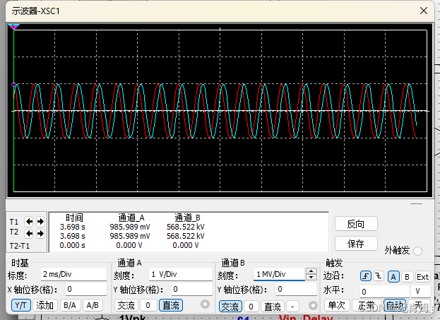 可看到输出输入波形确实存在一定延迟且并未失真 ,至于幅频的恒定加值是没有调整最后的反向比例器到最精确的状态