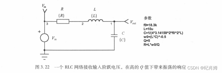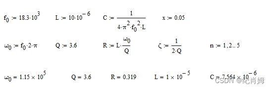 已知确定一个无零点的二阶系统的传函实际上只需要求得两个未知量,即品质因数 Q 或称为 阻尼比 ζ ,以及固有频率点 w0 。此式子中两者均是直接给出。又因为 w0 的值是由 C 与 L 的值决定、Q 由 w0 和 R 决定,因此设定了 L 的值,并从 w0 得出 C ,从 Q 得出 R ,进而通过定制二阶系统的参数而构造了实际的 RLC 电路