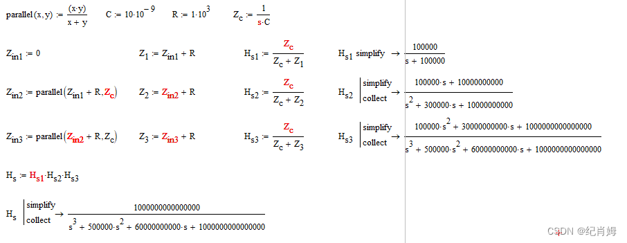 由于是无源系统,其二阶三阶的传函必须要计算其输入阻抗,不能是同一个无输入阻抗的 RC 低通滤波传函级联相乘三次,H(s) 中,首级电路的传函的输入阻抗为 0,而次级的输入阻抗计算,是将电压输入信号置 0,从这一级的输入端看出去的等效阻抗,如次级传函的阻抗为 RC 并联值