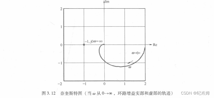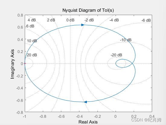 奈奎斯特图中,函数在 s 为 0 的时候是一个常数,一定位于实轴上某一个非零位置,而在无穷的时候一定收敛,而位于零,按理不可能呈现一条闭合曲线,但是 matlab 中其同时计算了正负频率,因此是一个对称的闭合曲线,与本书中呈现的不符,阅读时注意箭头方向仅阅读正频率单边即可