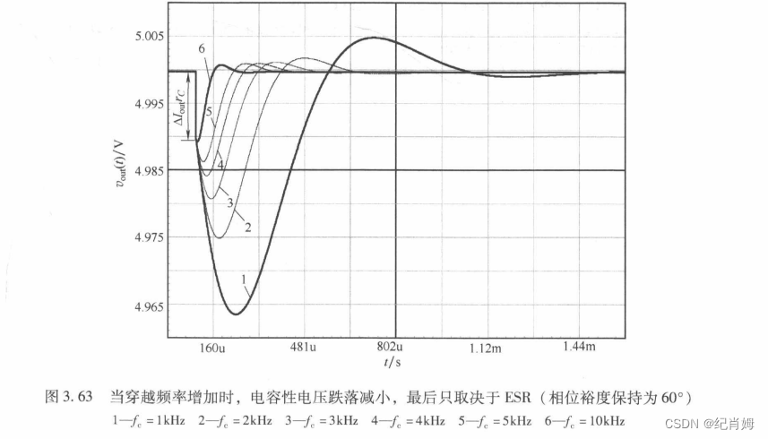 在保证系统稳定性的前提下,系统的穿越频率越高, 电容所带来的电压跌落的比例将越高,其响应速度将更快,跌落越低