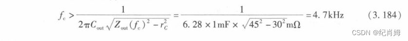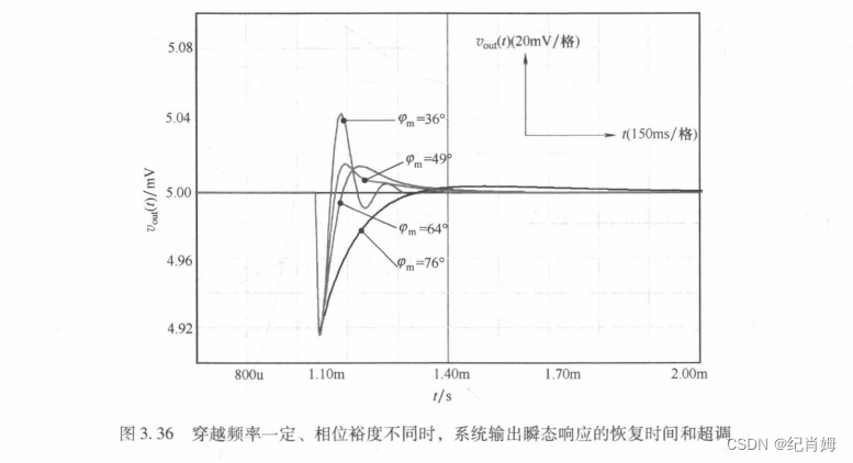 根据此表达式可以用于根据变换器输出电压跌落来设计穿越频率,已知相位裕度越小,系统 Q 值越大,电压跌落值(超调量)越大,当限制了超调量时,意味着同时限制了相位裕度,相位裕度可根据上式求得 fc 值