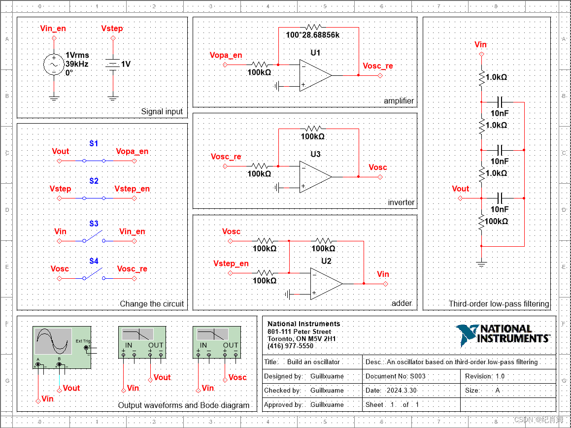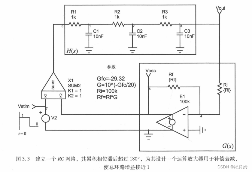采用反向比例放大以及反相器的组合来改变信号增益,这种方式与差分比例放大相比参数更好调整,缺点是增加了一个放大器,在实际电路设计中是需要被优化的部分。接下来讨论带有增益补偿,即 G(s) 补偿器的三阶 RC 低通滤波构成的振荡器特性