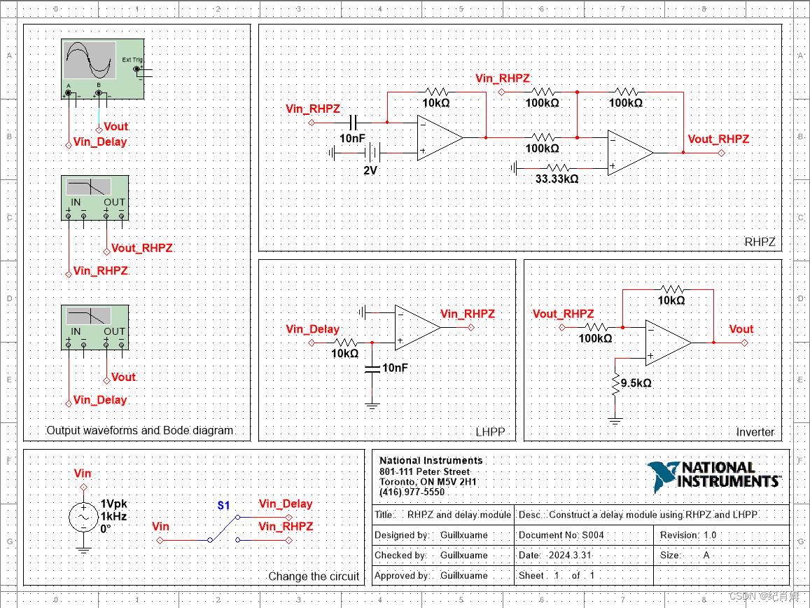 在 multisim 仿真中可以通过模拟理想运放获取延时模块如下