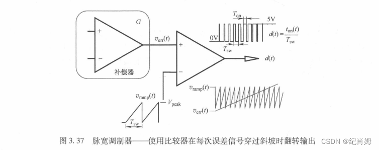接下来开始补全系统其他所需要注意的参数,首先是系统群延时,以脉宽调制器为例,其电路图如下,其输入信号为 verr 误差电压,输出信号为 PWM 脉宽波,将这一系统体现在控制系统中时存在不可忽视的增益 1/Vpeak