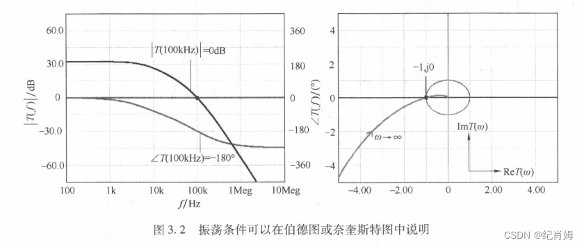 系统是否振荡也可通过伯德图或者奈奎斯特图判断,在伯德图中,Tcl(s) 即环路增益曲线在穿越 0dB 频率点相位正好滞后 180°,在奈奎斯特中,曲线正好过 ( -1 , j0 ) 点