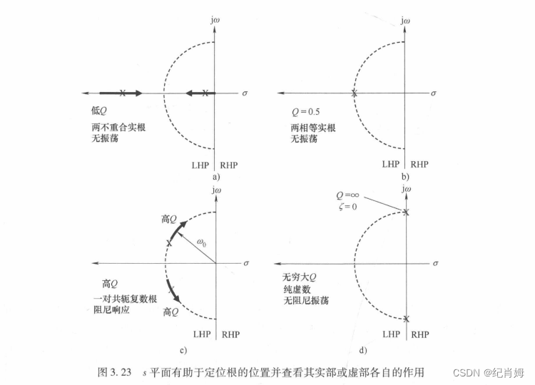 上述的阻尼从高到低的 4 种状态,过阻尼、临界阻尼、欠阻尼、无阻尼均可在根轨迹图中得出,其分别对应着下图 a b c d 4 个区域