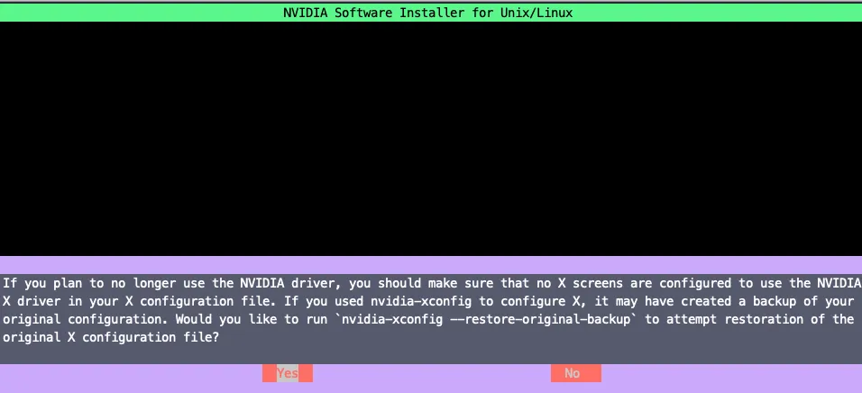 Would you like to run the nvidia-xconfigutility to automatically update your x configuration so that the NVIDIA x driver will be used when you restart x? Any pre-existing x confile will be backed up.