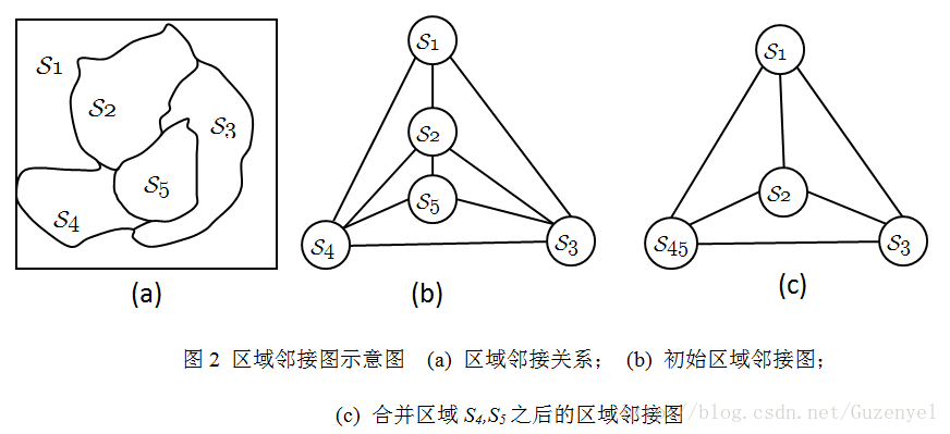 区域合并的代价:最早,区域合并是问题的数学解释其实是分片的影像拟合(Jean-Marie Beaulieu,1989, IEEE TPAMI, Hierarchy in Picture Segmentation: A Stepwise Optimization Approach ),每次的区域合并都会带来整个拟合误差的增加,这个增加量称之为合并代价,在图2中表现为,图的每条边都是有权重的,这个权重就表示这两个区域合并对整个图像拟合误差带来的增加量,具体的推导参见原文吧。