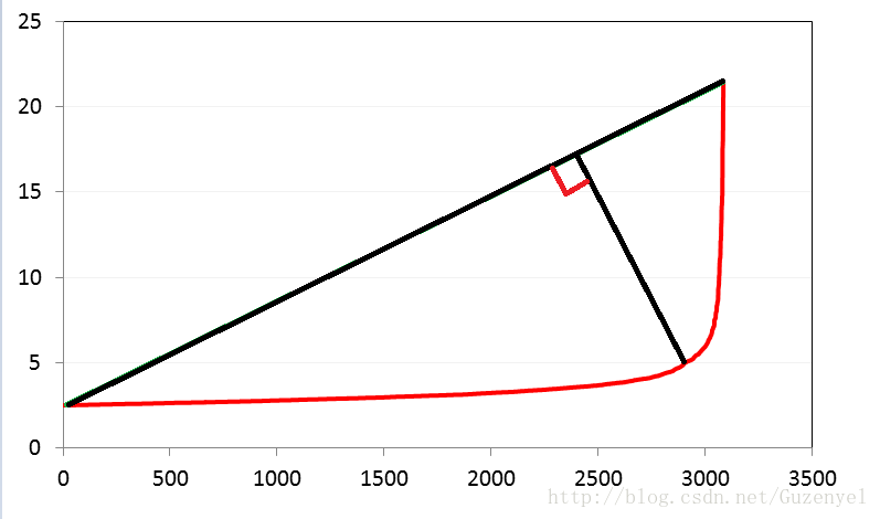 言归正传,这块儿,个人仅限于对遥感图像处理领域有些了解,可能在计算机视觉和模式识别中的很多方法不知道。在此,仅推荐一个比较简单,但是有效的方法。借助于ISPRS Journal那篇文章的方法,你可以计算初始分割和每次合并之后的 Global Homogeneity,依次合并得到一个序列,直到所有的可能的合并进行到底(只剩下一个1个区域了),这时候你就可以得到一条Global Homogeneity演化的曲线,大概如下(红线),那么把最低点和最高点连成直线,计算所有点到这条直线的距离,距离最大的点就是区域合并该停止的点。 这个只能保证你得到一个比较好的结果,但是对于很多计算机视觉的应用,大概已经足够了。至于更好的方法,暂时还不太适合公开...