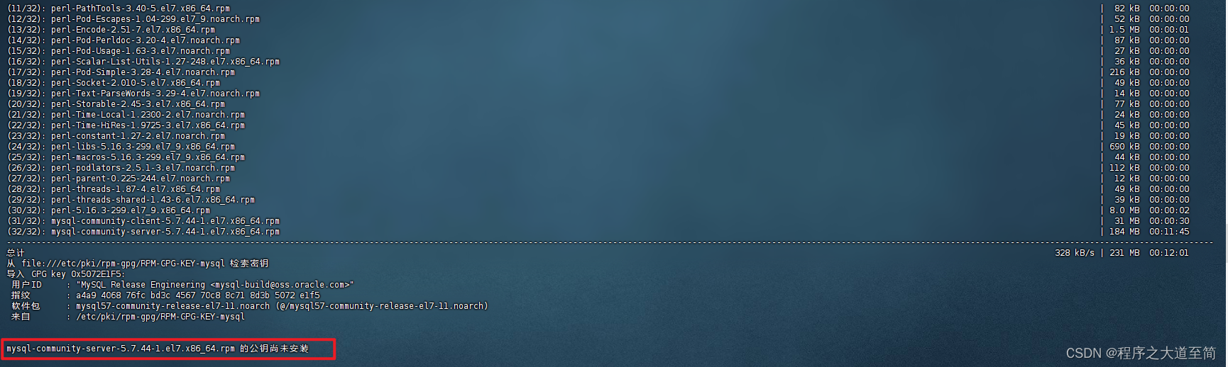 在Centos7.9使用yum安装MySQL时出现错误,提示:mysql-community-server-5.7.44-1.el7.x86_64.rpm 的公钥尚未安装,如下图所示:
