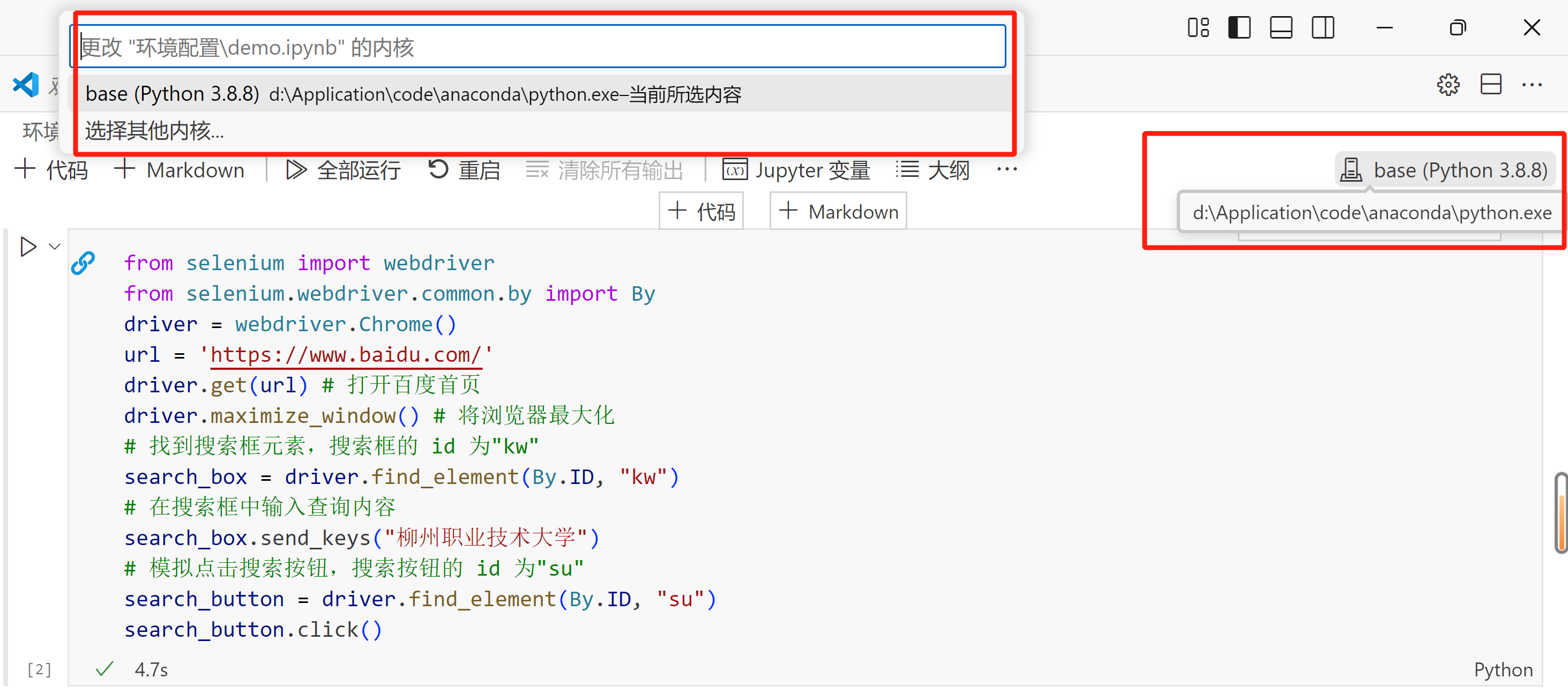 (3)在右上角选择ipynb文件的Python解释器后即可运行Python程序