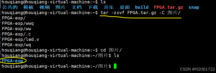 还有一个操作就是解压到其他文件目录里面,指令是"tar -zxvf +filename -C +压缩目标路径"操作如下所示,注意-c 这里是大写的C;