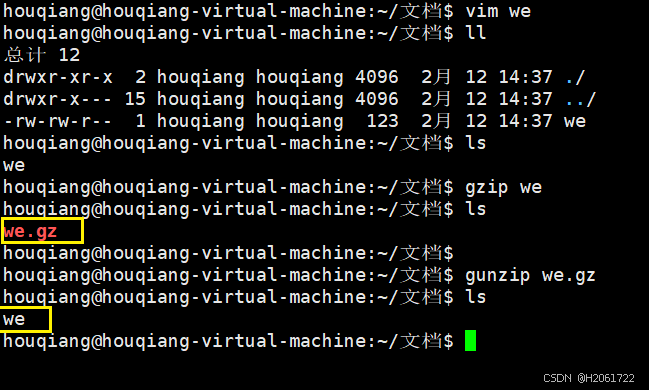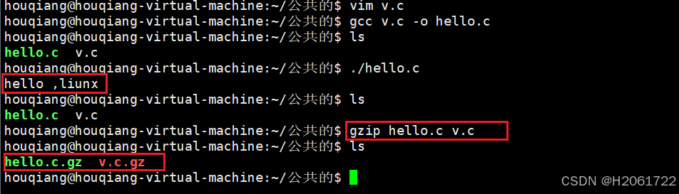首先是gzip 这个指令,这个指令是只能用来压缩文本文件的,不能用来进行对文件夹目录的压缩,使用方式:gzip +filename,这样就可以完成对文件的压缩操作了;如下图所示:这里面的操作呢,我是使用vim 编辑器写了一段C代码,然后使用gcc编译器对其进行编译,之后使用gzip的指令将其进行压缩,压缩的格式就是.gz的格式,小伙伴儿们注意一下哈,我这里是同时压缩的俩个文件(顺便做了多个文件压缩的练习哈哈哈),一个是C代码文件,一个是经过gcc编译器编译过后的可执行的文件;