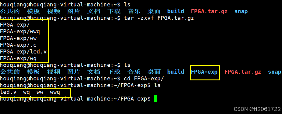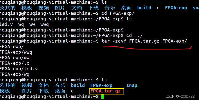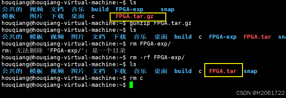 还是以上面的压缩文件为素材吧,使用"gunzip"将这个文件进行解压缩,就得到了名字为"FPGA.tar"的文件包,注意这里并不是一个压缩文件,只是一个文件包,被"tar"这个工具给进行打包操作了;需要进入看到这里面的文件是需要 tar来进行解包操作的;