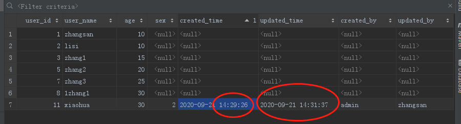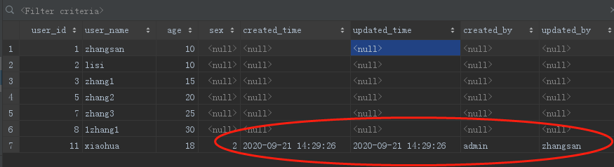 如上:我们只设置了姓名、年龄和性别,我们期望创建时间、更新时间、创建人、更新人这些能自动填充上,看下执行后数据库的结果: