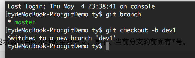 此时,再执行git branch查看当前本地所有分支,就会看到两个分支:master与dev1.