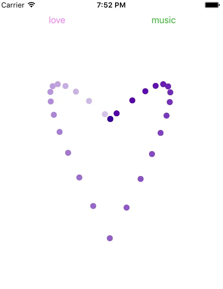 _loveLayer = [CAReplicatorLayer layer]; _loveLayer.instanceCount = 40; // 复制39个子layer+原本的子layer共40个layer _loveLayer.instanceDelay = 0.2; // 每隔0.2出现一个layer _loveLayer.instanceColor = [UIColor colorWithRed:1.0 green:1.0 blue:1.0 alpha:1.0].CGColor; _loveLayer.instanceGreenOffset = -0.03; // 颜色值递减。 _loveLayer.instanceRedOffset = -0.02; // 颜色值递减。 _loveLayer.instanceBlueOffset = -0.01; // 颜色值递减。 - [_loveLayer addSublayer:tView.layer];
