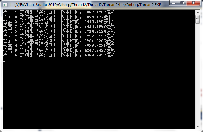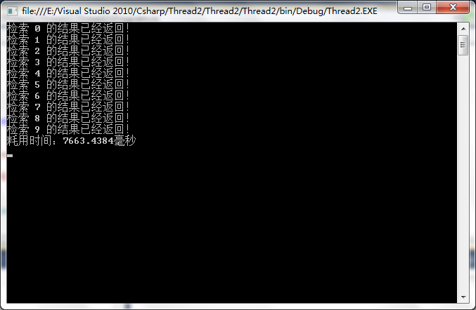 1 using System; 2 using System.Collections.Generic; 3 using System.Linq; 4 using System.Text; 5 using System.Threading; 6 using System.Diagnostics; 7 using System.Threading.Tasks; 8 using System.Net; 9 10 namespace Thread2 11 { 12 class Program 13 { 14 static DateTime start; 15 static void Main(string[] args) 16 { 17 start = DateTime.Now; 18 string strReq = "http://www.baidu.com/s?wd={0}"; 19 for (int i = 0; i < 10; i++) 20 { 21 var req = WebRequest.Create(string.Format(strReq, i)); 22 var res = req.BeginGetResponse(ProcessWebResponse,req); //这是同步方法 23 } 24 Console.ReadKey(true); 25 } 26 private static void ProcessWebResponse(IAsyncResult result) 27 { 28 var req = (WebRequest)result.AsyncState; 29 string strReq = req.RequestUri.AbsoluteUri; 30 using (var res = req.EndGetResponse(result)) 31 { 32 Console.Write("检索 {0} 的结果已经返回!\t", strReq.Substring(strReq.Length - 1)); 33 Console.WriteLine("耗用时间:{0}毫秒", TimeSpan.FromTicks(DateTime.Now.Ticks - start.Ticks).TotalMilliseconds); 34 } 35 } 36 } 37 }