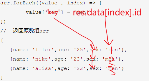 Each child in a list should have a unique “key“ prop.数据缺少key值的报错 思路:将获取到的数据进行循环遍历,使用forEach方法在每一项元素中加入key这个属性,把id属性赋值给新增的key,后生成一个新的数组,将新数组赋值给数组所需要的地方即可。