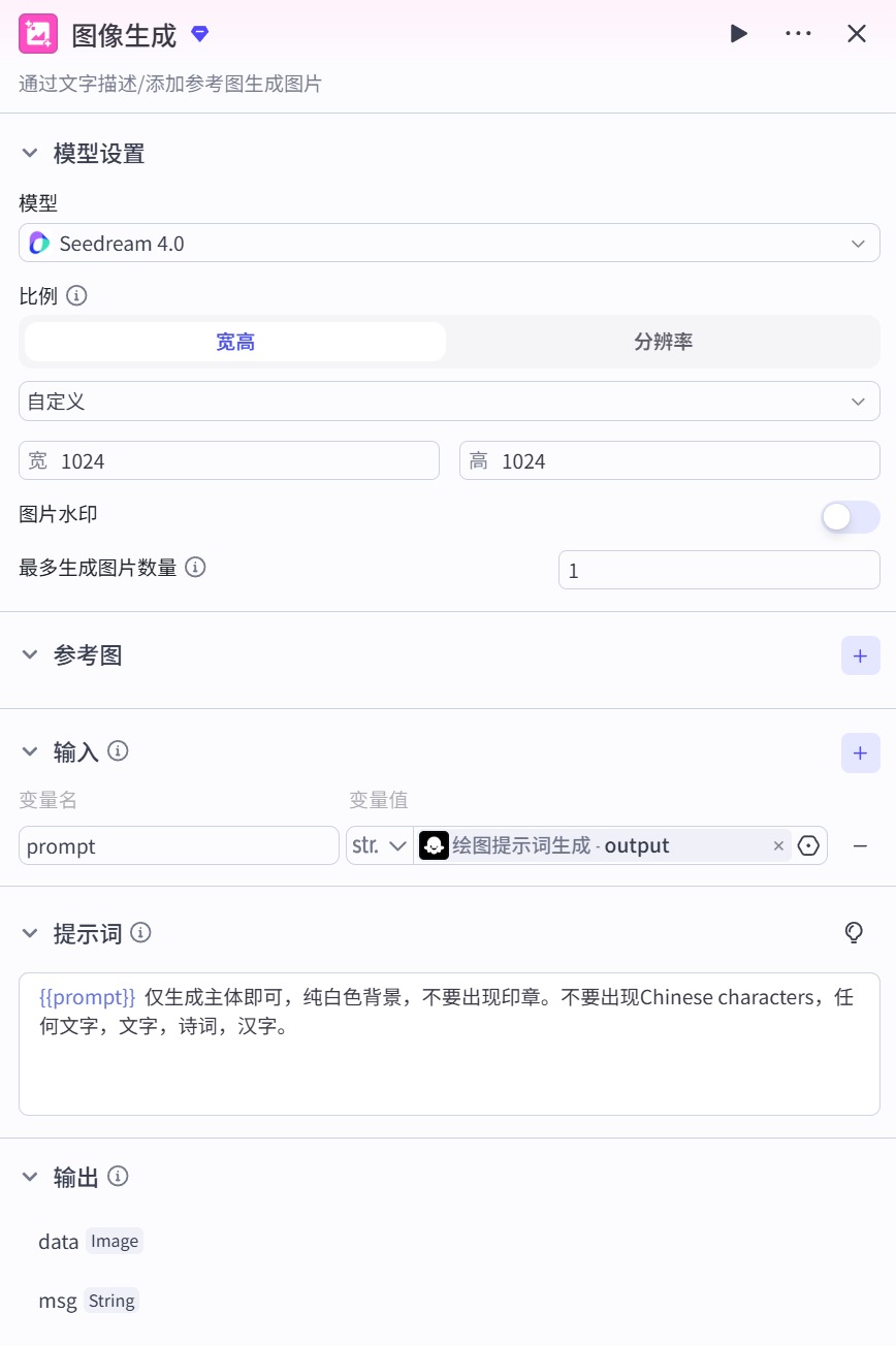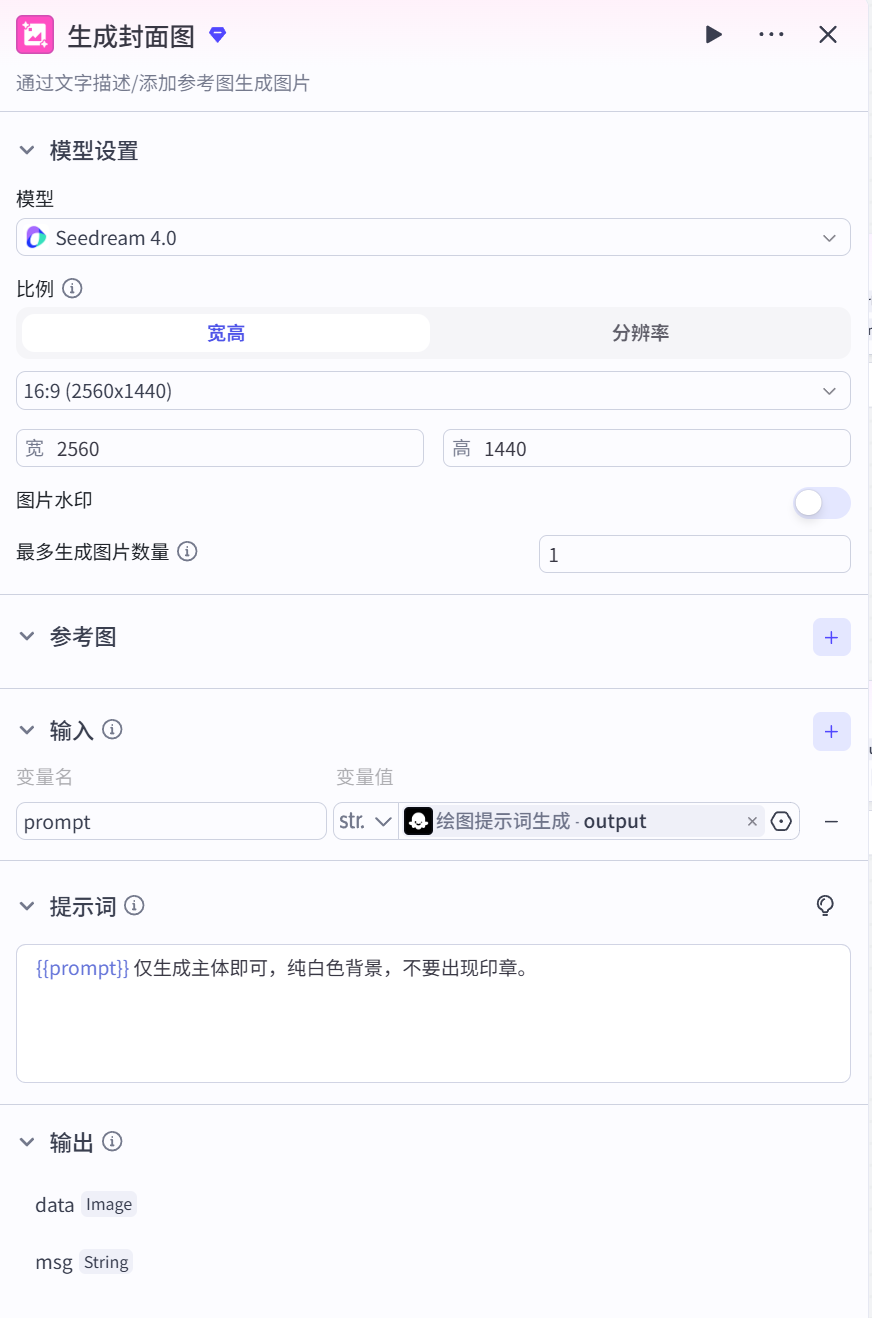 这个地方使用到了官方的【图像生成】节点,用于生成文章封面图。