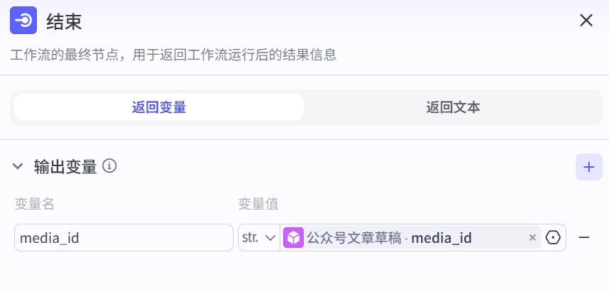 这个节点用来把生成好的漫画图片上传到公众号素材库中,取得图片的访问地址后进行文章的排版。使用到了扣子三方插件【微信公众号接口】的【wx_upload_image】工具。