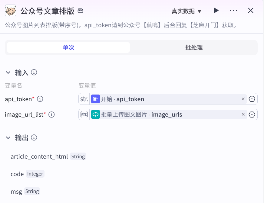 这里使用到了扣子第三方插件【公众号文章模板】的【image_list_number_layout】工具,是原先图片列表排版工具的升级版,增加了图片序号。
