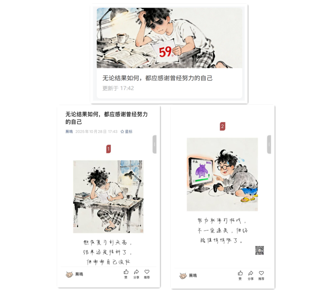 在讲解工作流之前,我们先看看工作流运行的效果。比如我输入了一个“无论结果如何,都应感谢曾经努力的自己”这么一个主题,选定生成10张漫画,工作流经过约5分钟的运行,一篇小林爆款漫画就在公众号草稿箱中出现了。