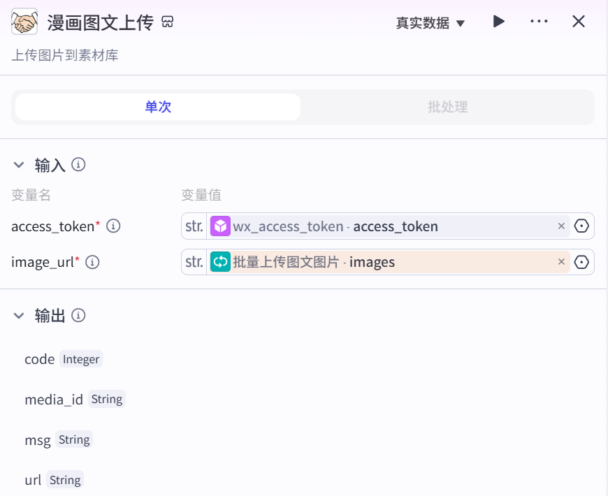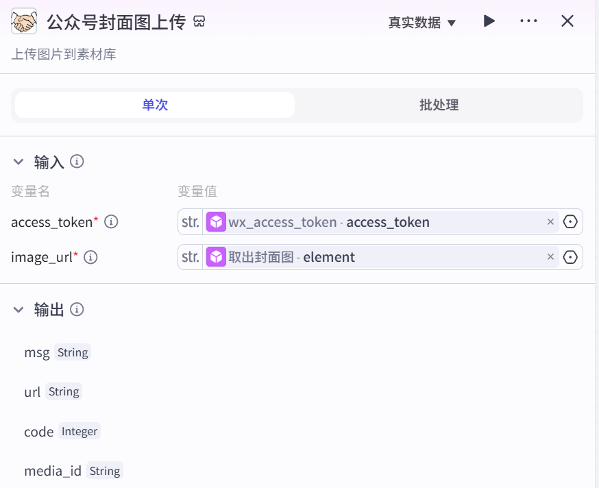 这个节点用来上传公众号的封面图,使用到了和【2.10. 漫画图文上传】节点相同的工具。