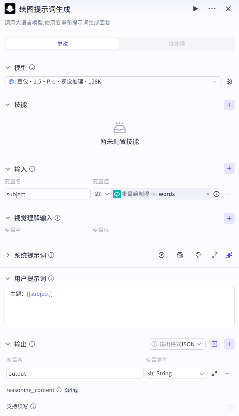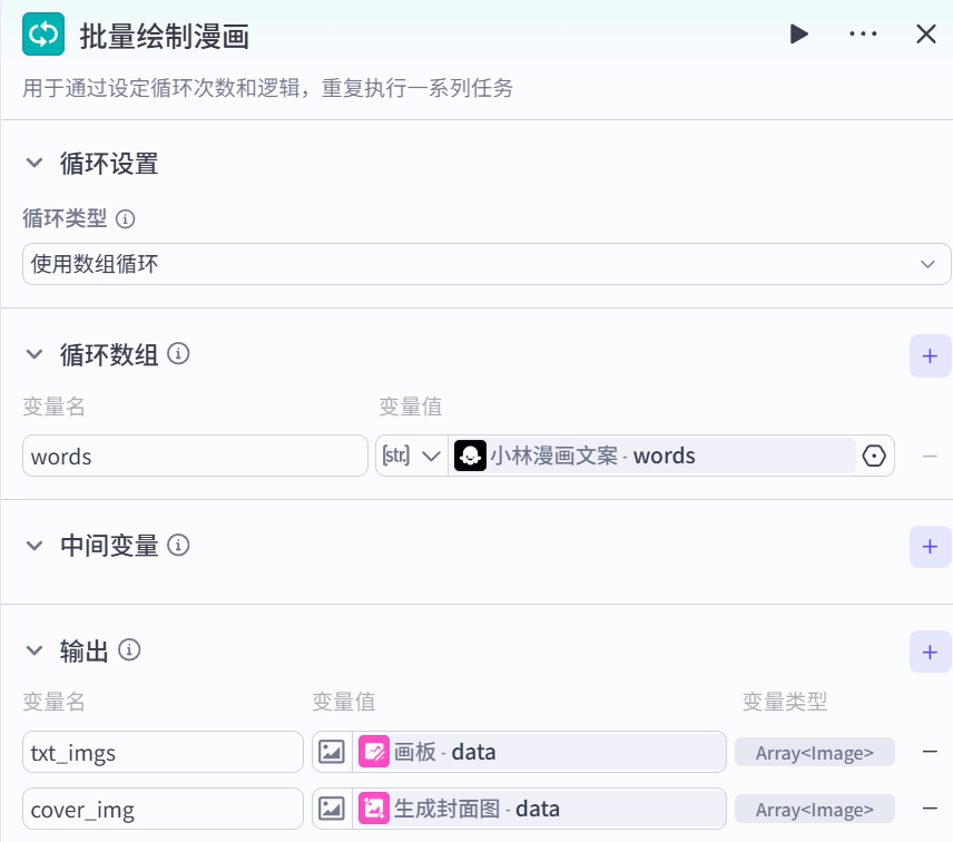 这个节点用来根据生成的小林漫画文案数量来绘制对应的文案配图,使用到了扣子官方的【循环】节点。