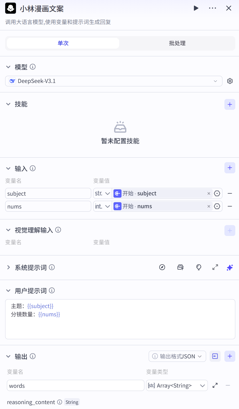 这里使用了大模型节点,通过模仿小林漫画文案的结构和风格,生成小林漫画文案,这里选择DeepSeek-V3大模型,它更擅长理解文案结构,生成好的文案,它的缺点就是比较慢,它的参数如下: